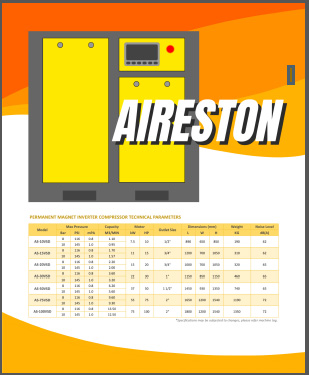 AIRESTON permanent magnet inverter air compressors are designed for high efficiency, stable air supply, and reduced energy consumption. Using variable-speed inverter technology and permanent magnet motors, these compressors deliver consistent pressure with low operating noise, making them suitable for continuous industrial use.